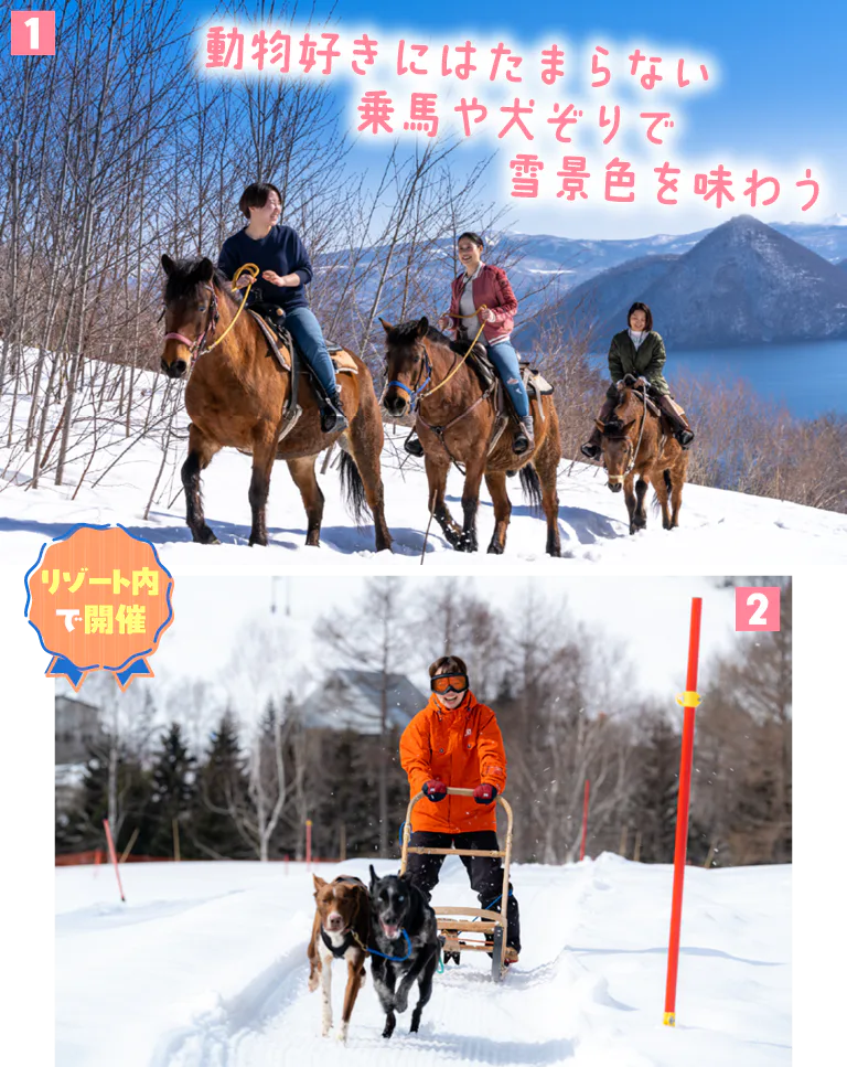 1.未経験でも楽しめる「乗馬 洞爺コース」。1人1万1550円、所要約30分 2.400mのコースを1周する「犬ぞり」。4歳以上1人4950円~、所要約15~20分