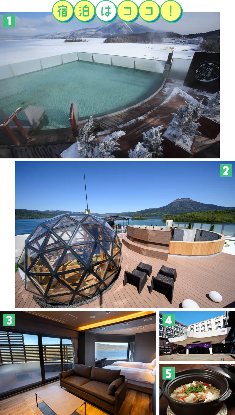 1.大パノラマが堪能できる8階大浴場の「天空露天風呂 天女の湯」 2.屋上には断熱ガラス製の「ドーム型展望サウナ」を完備 3.阿寒湖を間近に感じる「別館“雅―MIYABI―”」の露天風呂付洋室 4.阿寒湖の西側に位置する宿は全5棟からなる 5.「和会席 紫翠」では阿寒湖周辺やオホーツクの旬の味覚を楽しめる