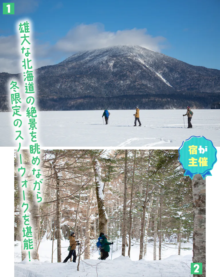1.凍った阿寒湖の上をクロスカントリースキーで歩く「阿寒湖上トレッキング」。1人3万5000円 2.阿寒摩周国立公園の魅力を気軽に堪能できる「ボッケの森スノーウォーク。1人1万2100円