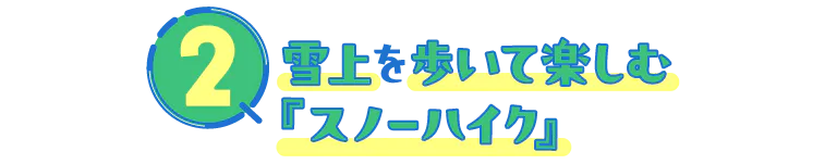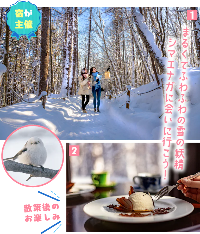 1.道具を借りて自由に楽しめる「クロスカントリースキー」 2.大型スノーモービルで森を散策する「シェルパで行くフォレストツアー」など、冬の自然を感じられるアクティビティが充実。