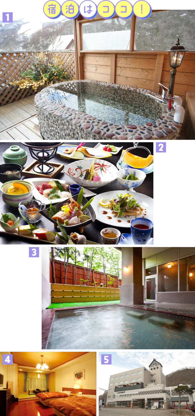 1.露天風呂付き特別室の露天風呂は石造り 2.品数が豊富な夕食は海鮮料理が自慢 3.朝里川温泉の柔らかな湯が自慢の露天風呂 4.自慢の露天風呂付き特別室。洋室に3畳間が付いている 5.豊かな自然に囲まれた小樽の老舗温泉ホテル