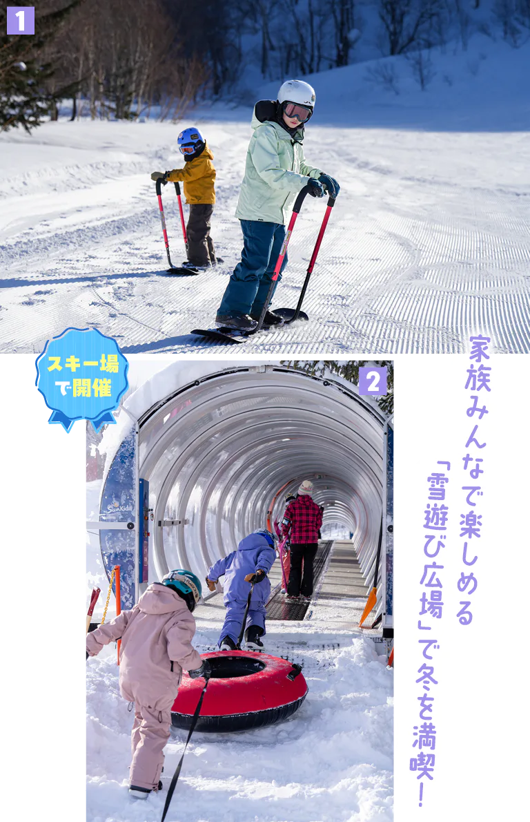 1.ゲレンデで楽しむスキーやスノーボード以外に、「雪遊び広場 SNOW PLAYGROUND」では、バー付きスノーボードやそりなど、さまざまなアクティビティが楽しめる。料金:1日6000円、3歳未満は無料。雪遊びアイテムは使いたい放題 2.新設された全長60mのスノーエスカレーターは乗り放題