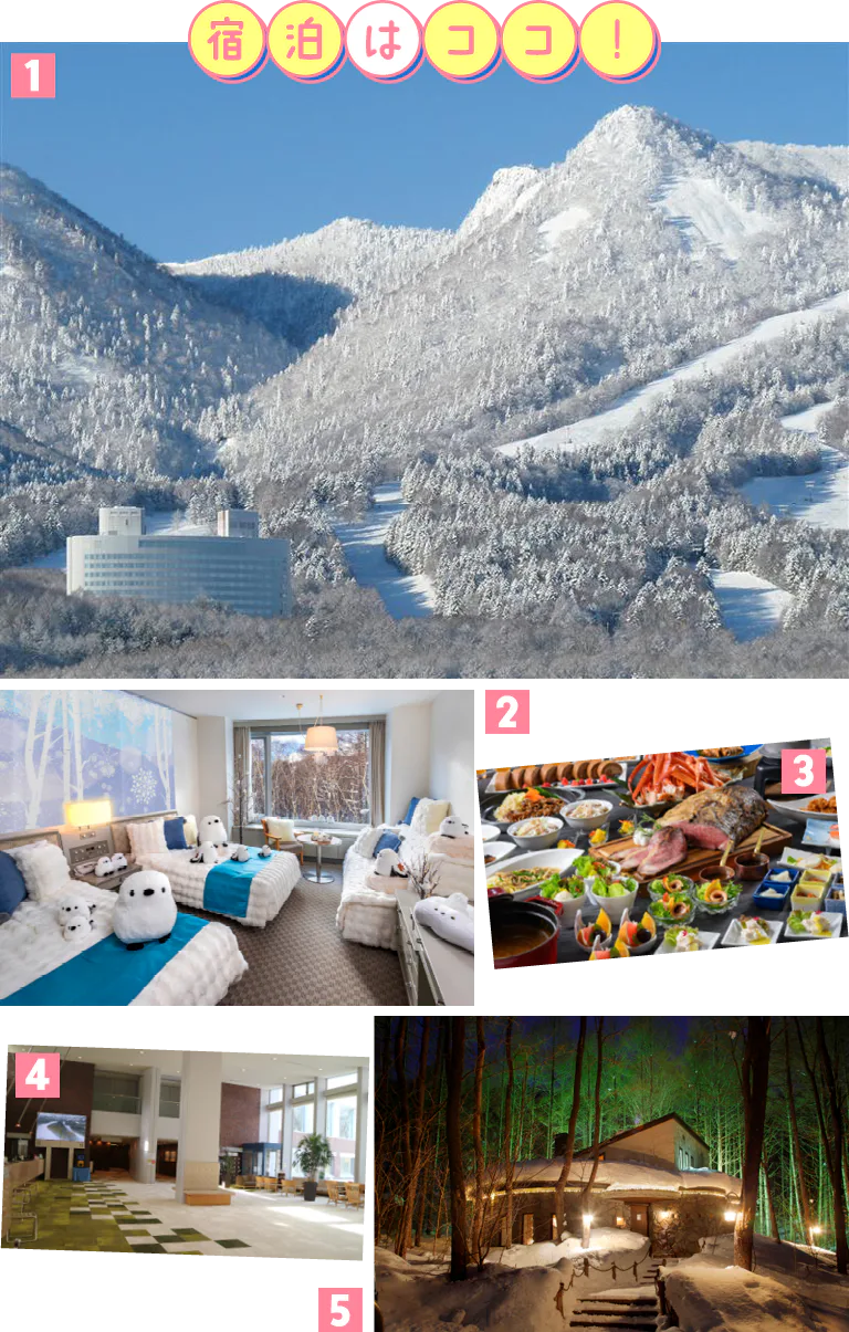 1.スキー場に隣接する大人のためのスノーリゾート 2.和の趣をモダンに昇華したスーペリアルーム 3.大浴場には露天風呂も完備。ゆったりとくつろげる 4.和食、フレンチ、イタリアン、中華など世界のグルメが味わえる 5.大きな窓からゲレンデを望める重厚感のあるロビー