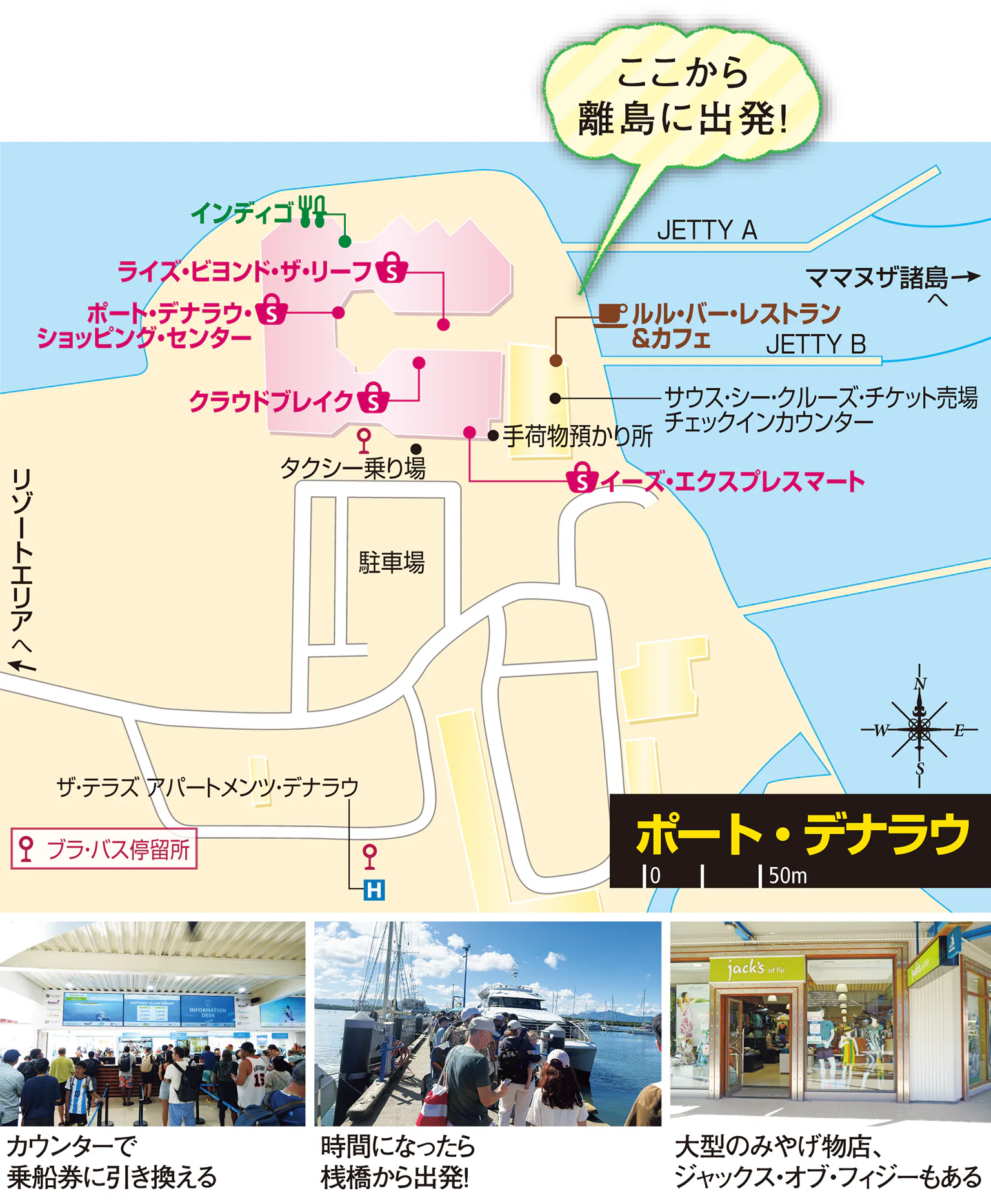 ナンディ国際空港から車で20分の人工島、デナラウ。買物や食事が楽しめる海辺のショッピングセンターのほか、離島行きの船が発着する船着き場もある。