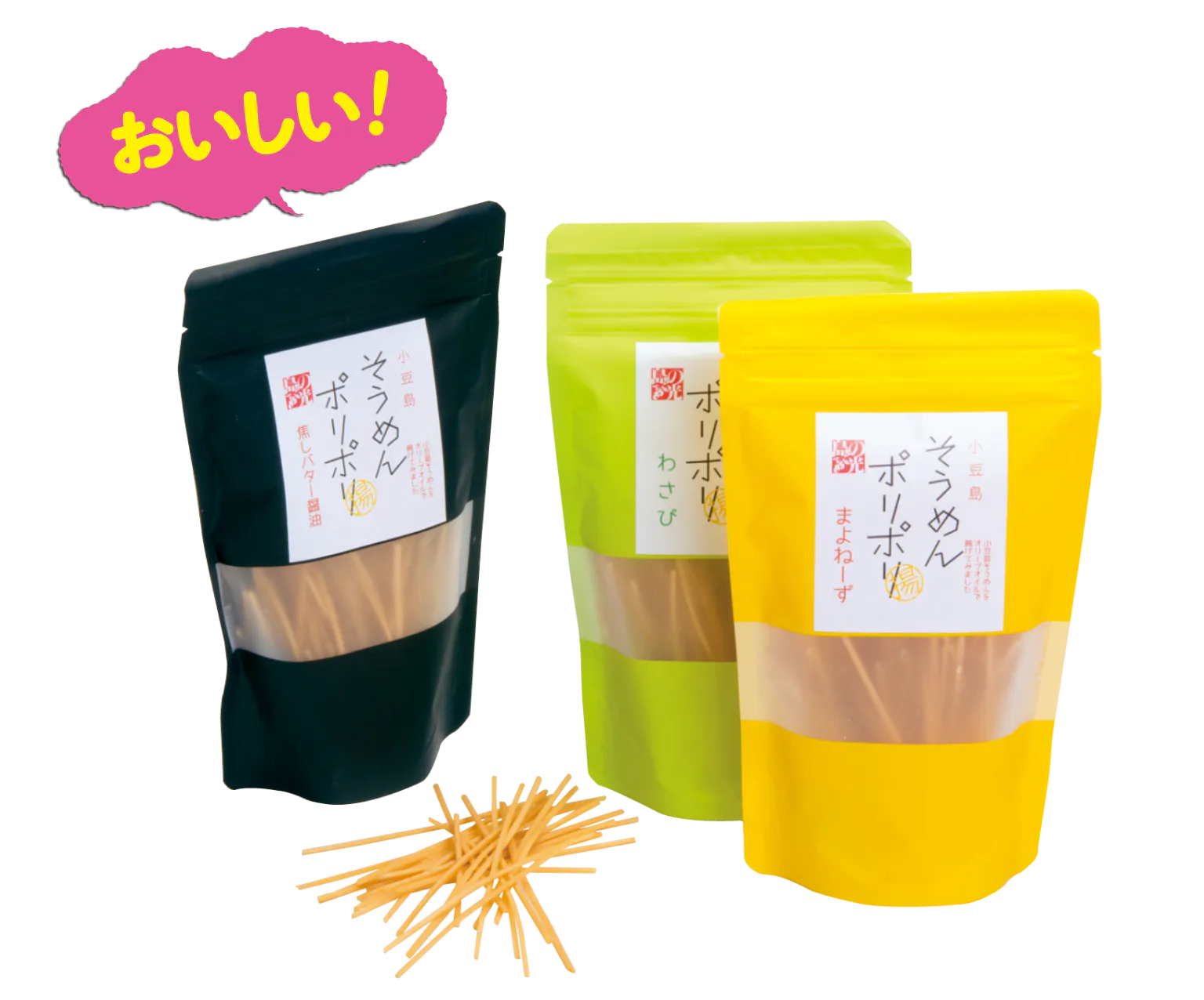 小豆島特産のそうめんをオリーブオイルでこんがり揚げたおやつ。焦がしバター醤油味、わさび味など味は6種類