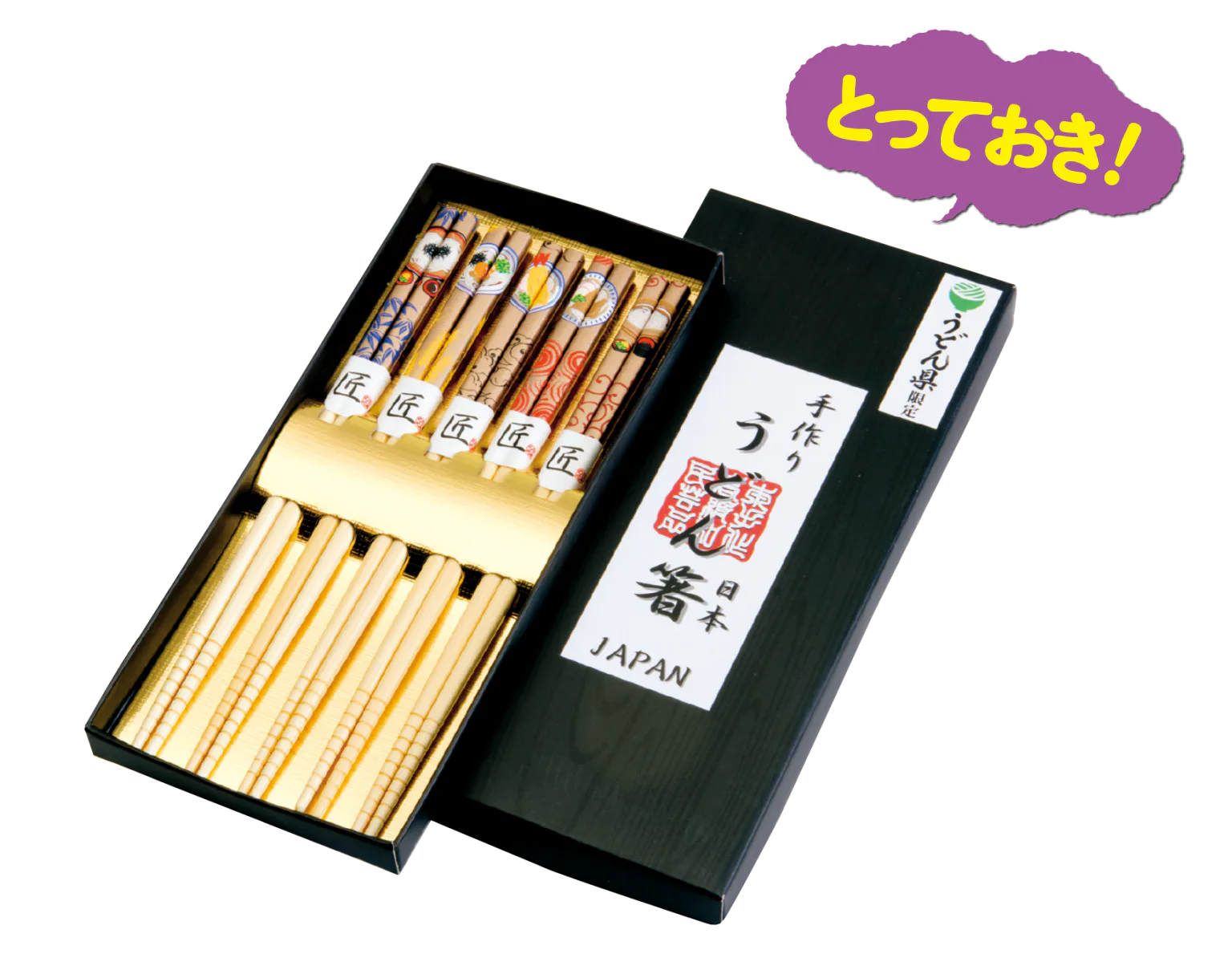 天ぷらうどんや釜揚げうどんなど、5種のうどんが描かれた5膳セット。うどん県限定品
