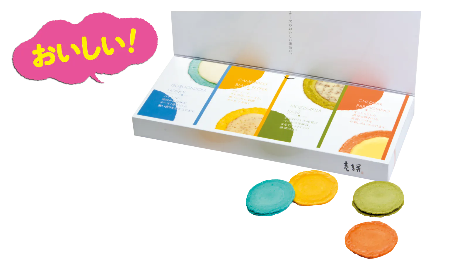 これぞ和風マカロン!? 4種のチーズをサンドした、軽い口どけのカラフルエビせんべい