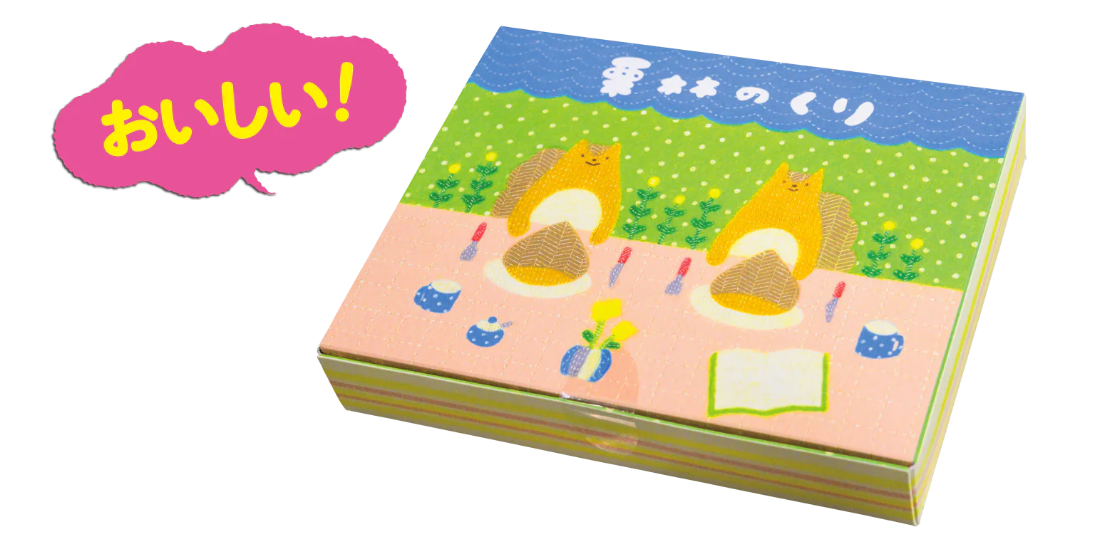 刻み栗が入った、キュートな見た目の栗まんじゅう。同店限定のパッケージデザインが好評