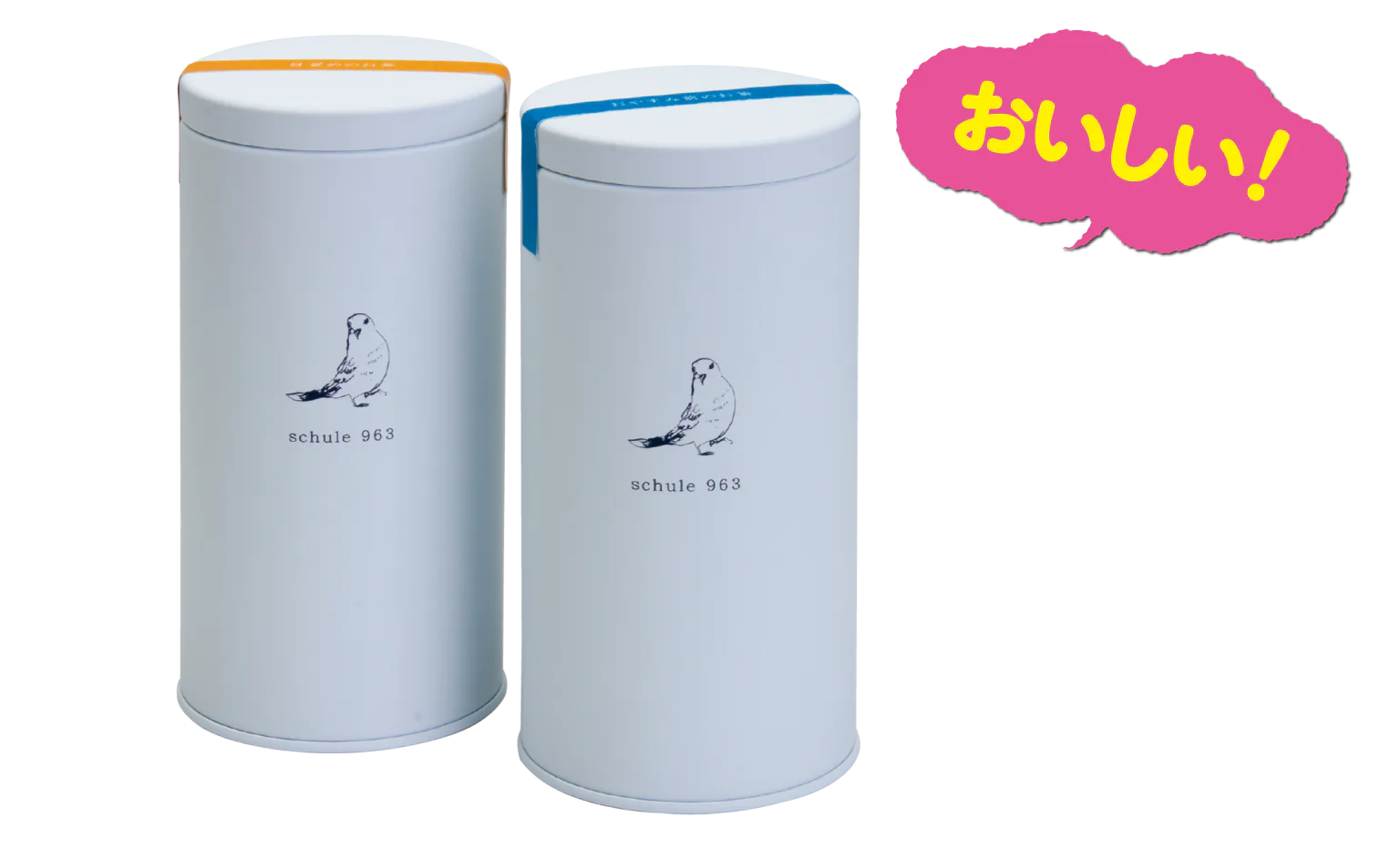 マスコットインコのまるちゃんのイラスト入り缶。目覚めはバラと阿波番茶、おやすみ前はカモミールとほうじ茶をブレンド