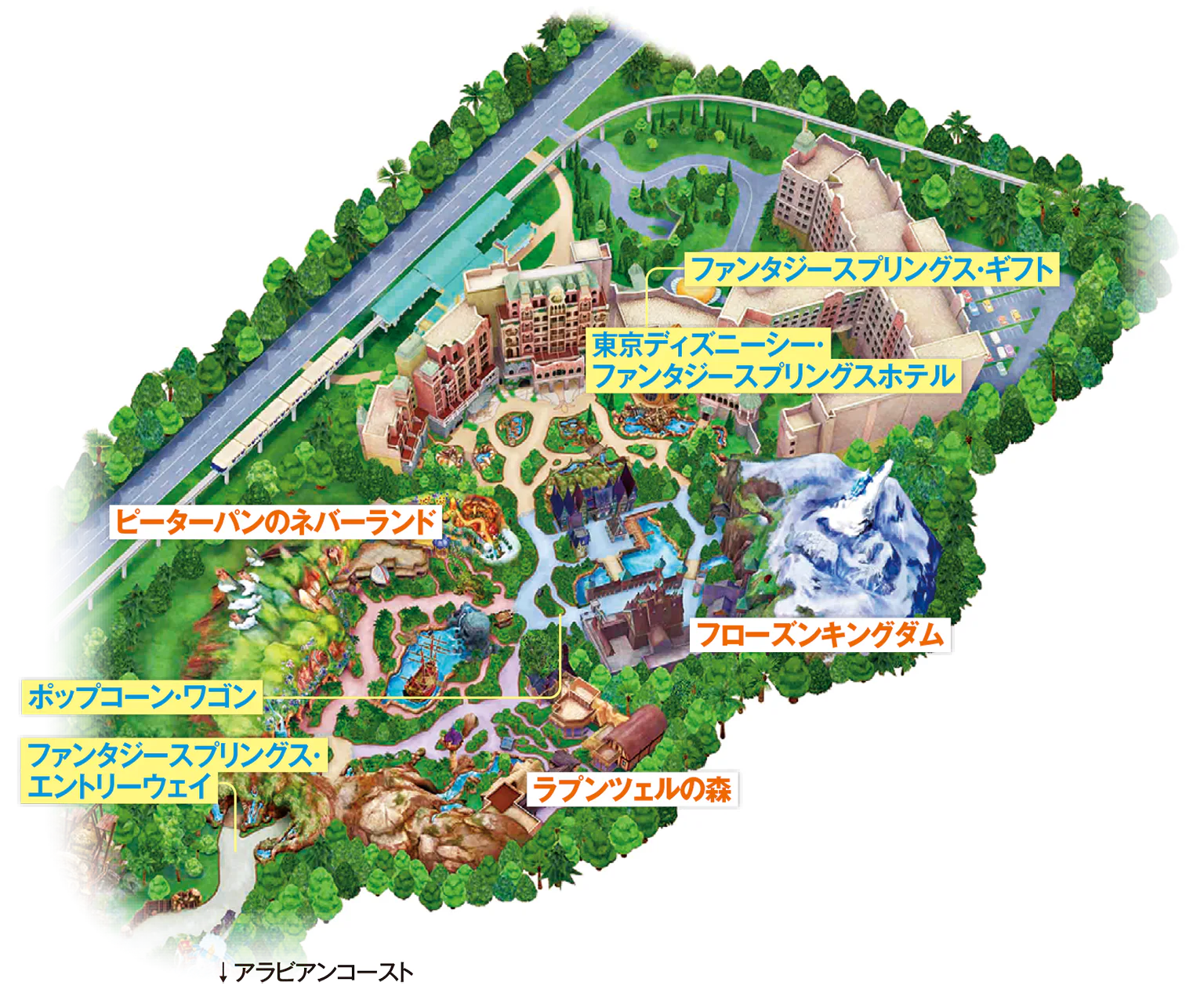 入口は東京ディズニーシーパーク内からの入口(ファンタジースプリングス・エントリーウェイ)と、ファンタジースプリングスホテル、東京ディズニーリゾート・トイ・ストーリー®ホテルの宿泊者専用入口の2カ所。パーク内の入口は、レイジングスピリッツとジャスミンのフライングカーペットの間にある。『アナと雪の女王』、『ピーター・パン』、『塔の上のラプンツェル』の魔法の泉が目印。