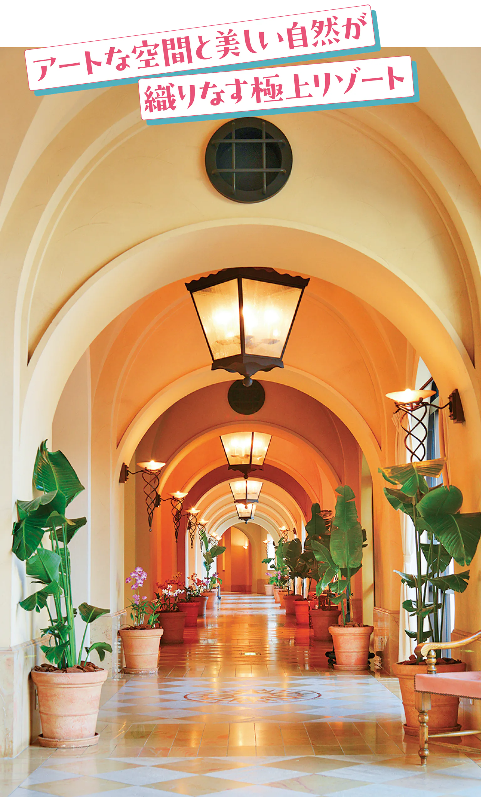 スペイン瓦と白壁が青空に映えるスパニッシュコロニアル調の建物が異国情緒たっぷり。館内はアートにあふれ、一歩外へ出ると南国の花々やプール、透明度を誇るビーチが視界に入り楽園のよう。多彩なレストランやリラクゼーションなどの施設も見逃せない。