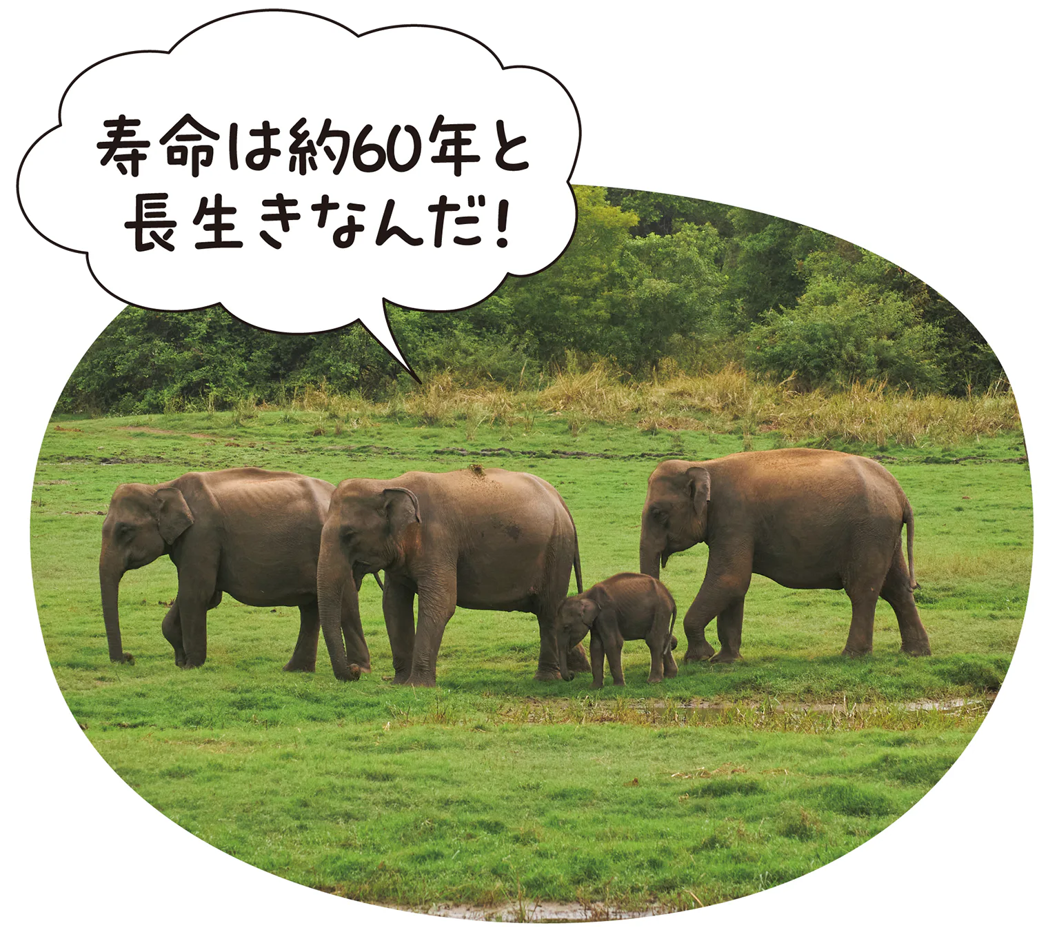 アジアゾウの亜種であるスリランカゾウは、アフリカゾウに比べやや小さいのが特徴。とはいえ体長は2〜3.6m、重さは2〜5.5tほどと近くで見ると十分大きい。1日に100〜200ℓの水を飲み、150kgものジャックフルーツの木などの葉を食べている。グループで行動する社交的な動物でもある。