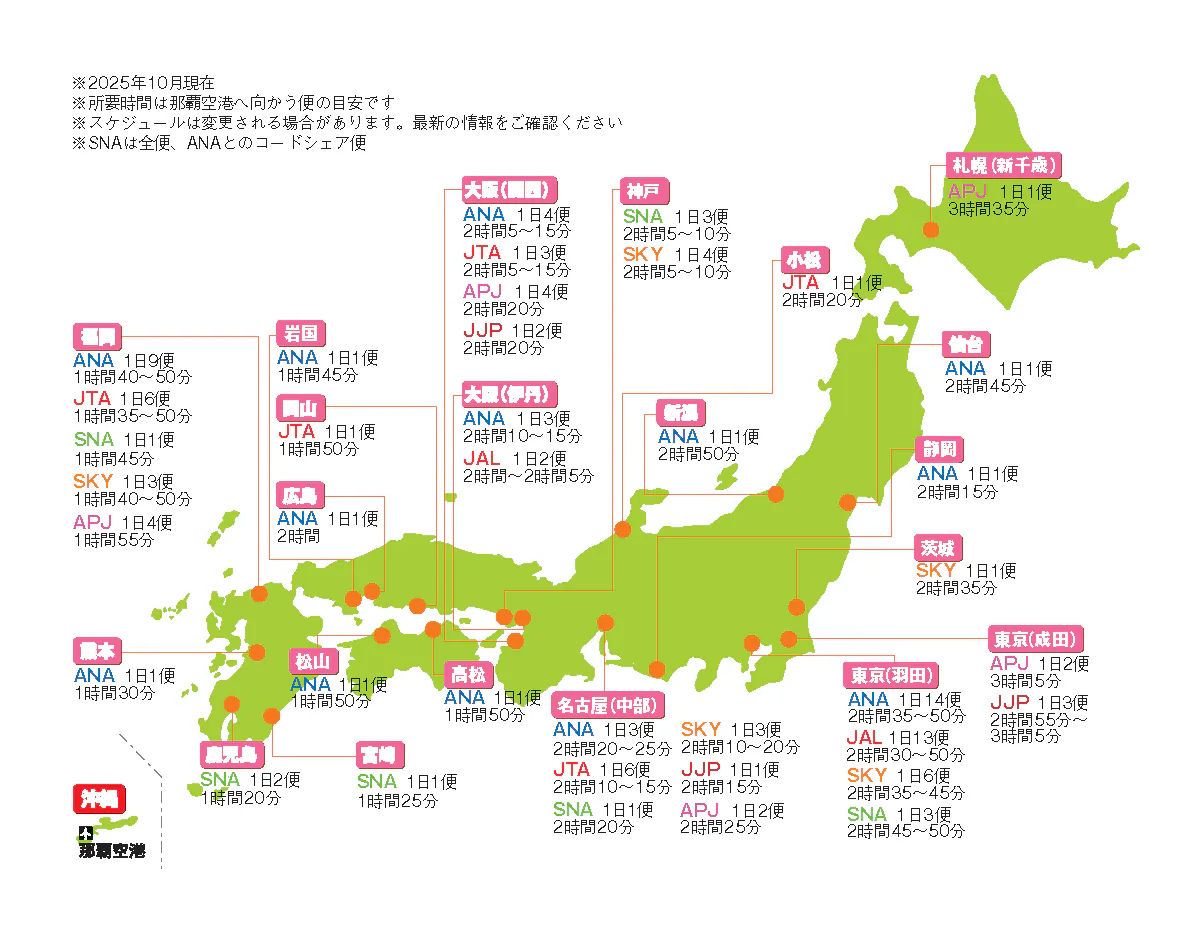 那覇へは、新千歳・成田・中部・関西・福岡からピーチが、成田・中部・関西からジェットスターが就航している。