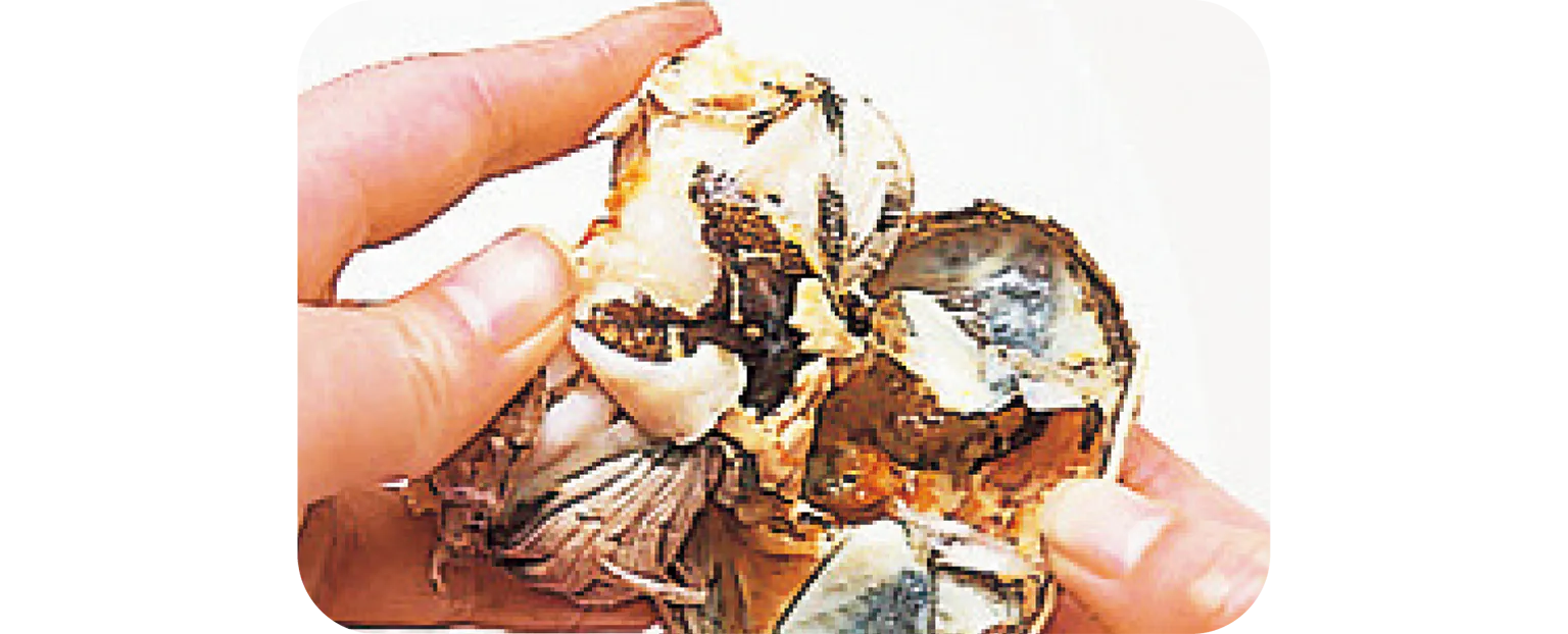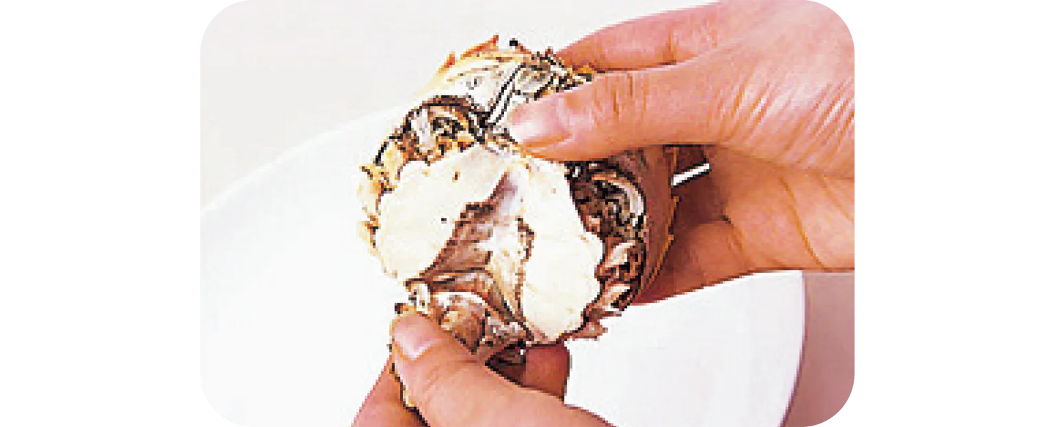お尻側から赤い甲羅を外し、左右にある灰色のヒラヒラした部分“ガニ”を取り除く。