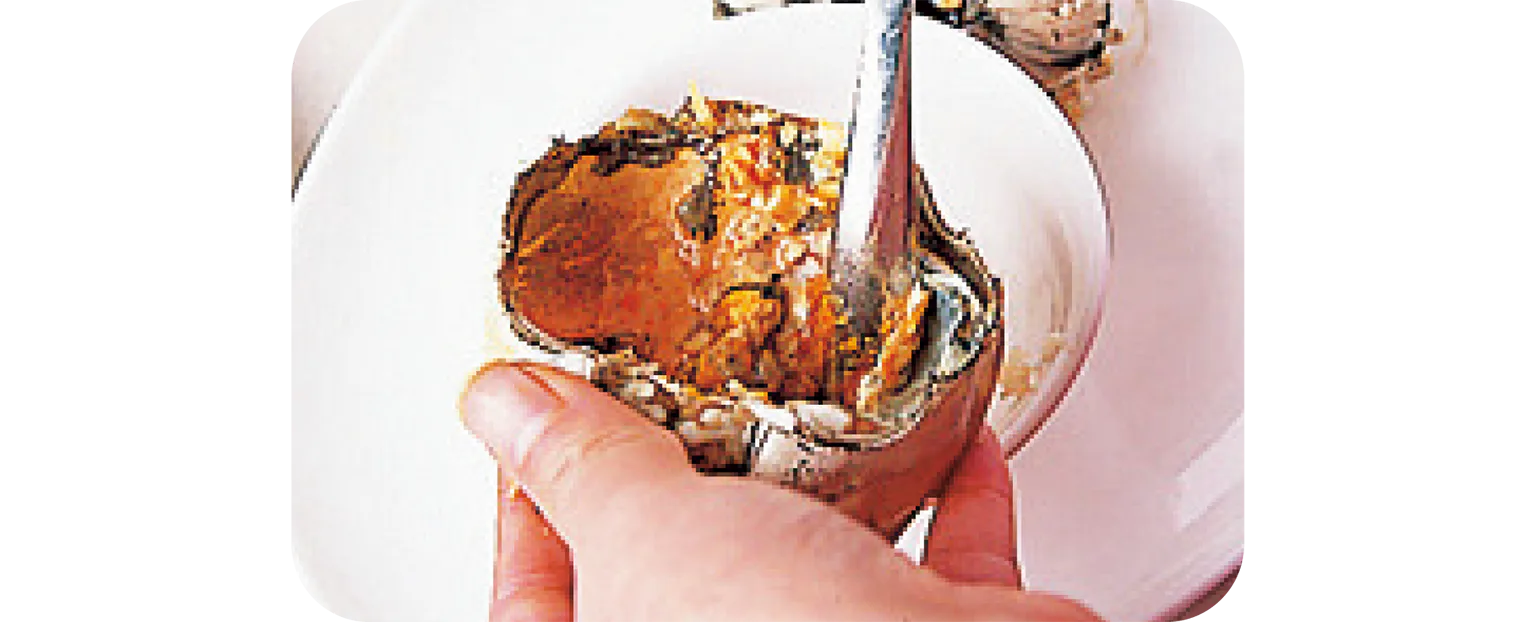 専用のスプーンやフォークを使用して、雄なら甲羅に詰まったみそ、雌なら卵を食べる。