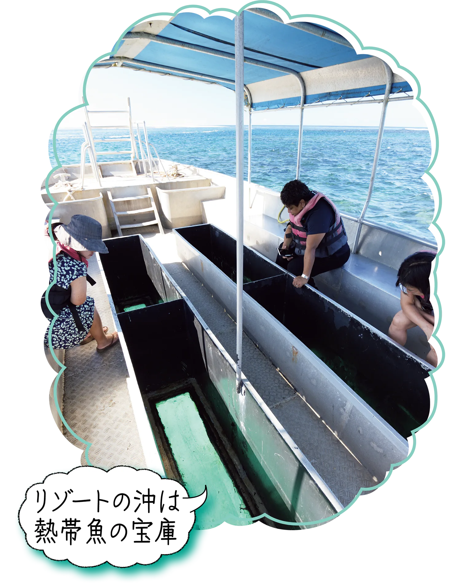 グラスボトムボートや、シュノーケリングツアーは無料で開催。サンゴ礁の周りで遊ぶ熱帯魚を間近で眺めよう。開催時間はアクティビティデスクで確認して。