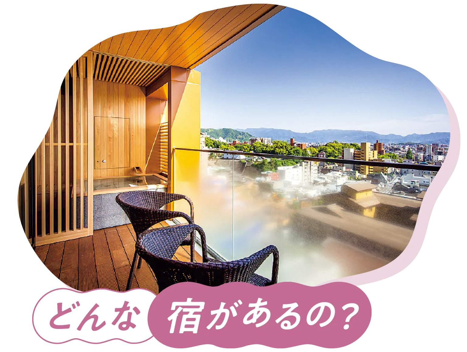 老舗の温泉旅館や料理自慢の宿など約30軒の宿泊施設があり、多くの宿が本館の周辺に集まる。外湯をメインに食事は街の飲食店で、という人には素泊まりのホテルなどもおすすめ。写真の道後御湯など露天風呂付き客室を備える温泉宿も人気。