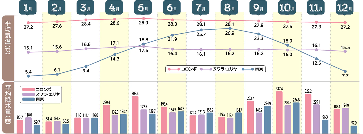 ※コロンボ、東京の平均気温、降水量は理科年表(2025)、ヌワラ・エリアは気象庁のデータによる