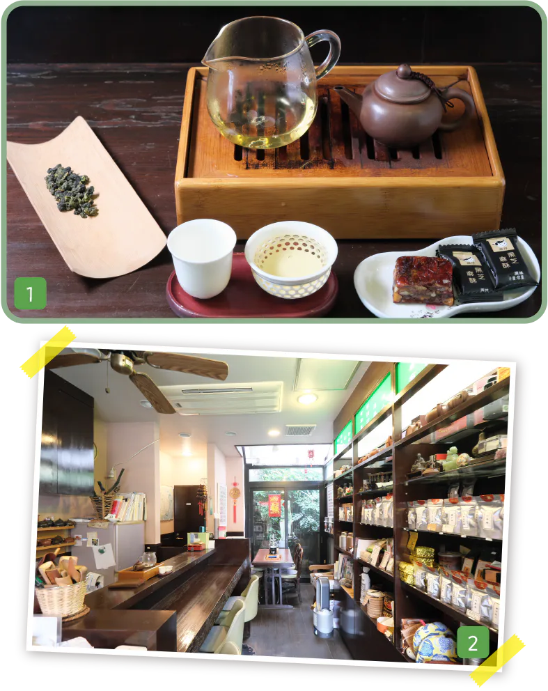 1.阿里山高山茶などの台湾茶600円~/ 2.小ぢんまりとした店内に茶葉や茶器がぎっしり