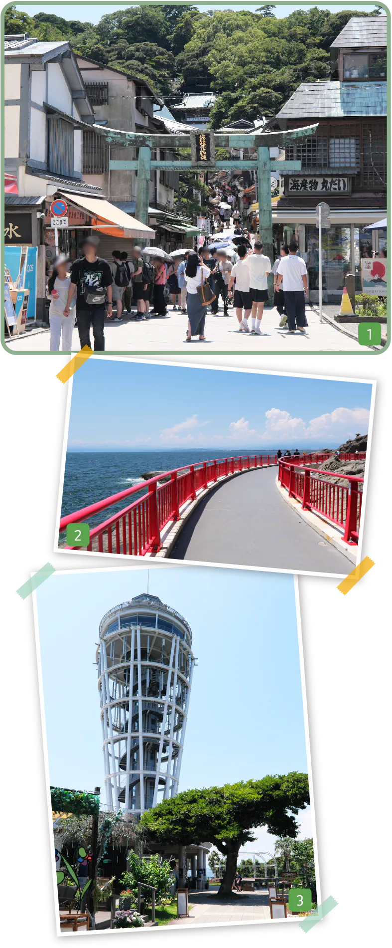 1.観光客で賑わう弁財天仲見世通り/ 2.江島岩屋へと続く海上の遊歩道/ 3.江の島のシンボル、江の島シーキャンドル