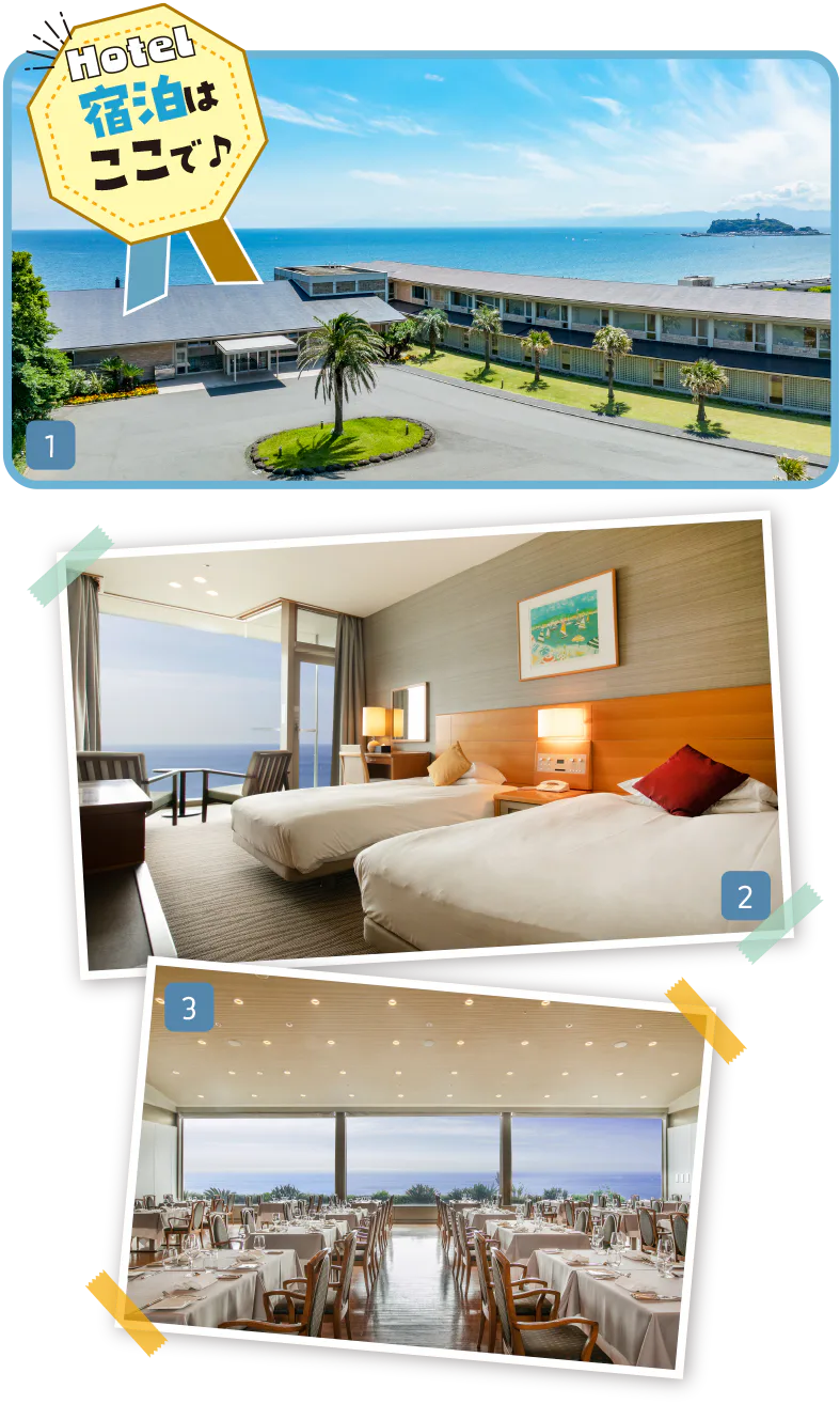 1.開放感抜群ロケーション/ 2.七里ヶ浜の海を一望できるツインルームB/ 3.レストラン ル・トリアノンでフランス料理を