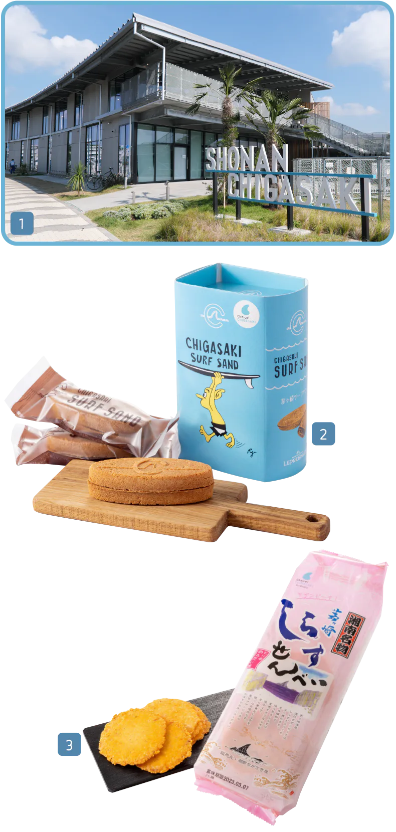 1.新湘南バイパス茅ヶ崎海岸ICからすぐ/ 2.茅ヶ崎サーフサンド1500円/ 3.茅ヶ崎しらすせんべい ピリ辛めんたい味734円