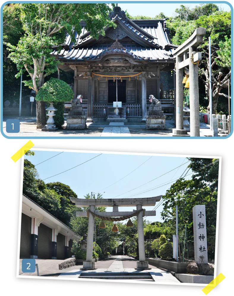 1.神社の拝殿。奥の展望台からは江の島を一望できる/ 2.国道に面した鳥居の奥に参道が続く