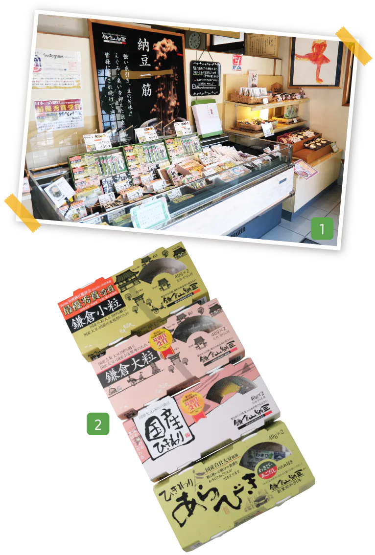 1.鎌倉の文化人たちも愛した納豆が並ぶ/ 2.鎌倉小粒245円、鎌倉大粒245円、国産ひきわり196円、あらびきひきわり259円