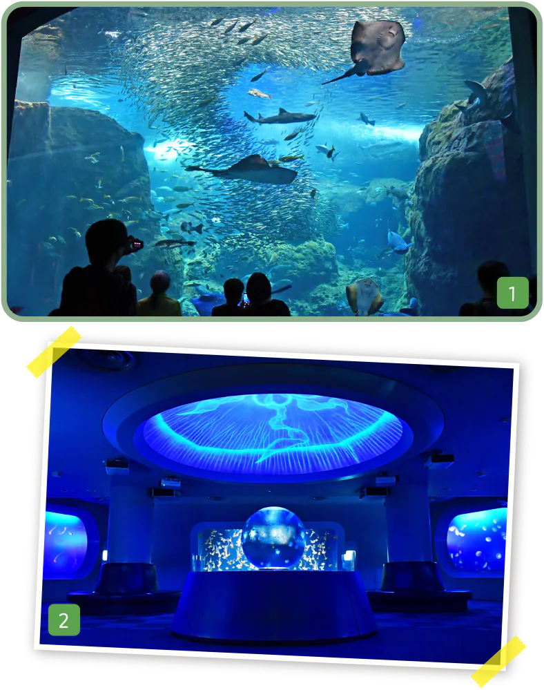 1.多彩な魚たちが泳ぐ相模湾大水槽/ 2.人気のクラゲファンタジーホール
