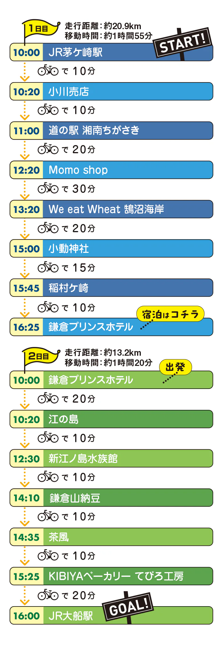 ゆっくりとチェックアウトしたら最寄りステーションで自転車をピックアップ。江の島周辺を満喫した後は、西鎌倉のショップやカフェに立ち寄りながら大船駅へと向かう。
