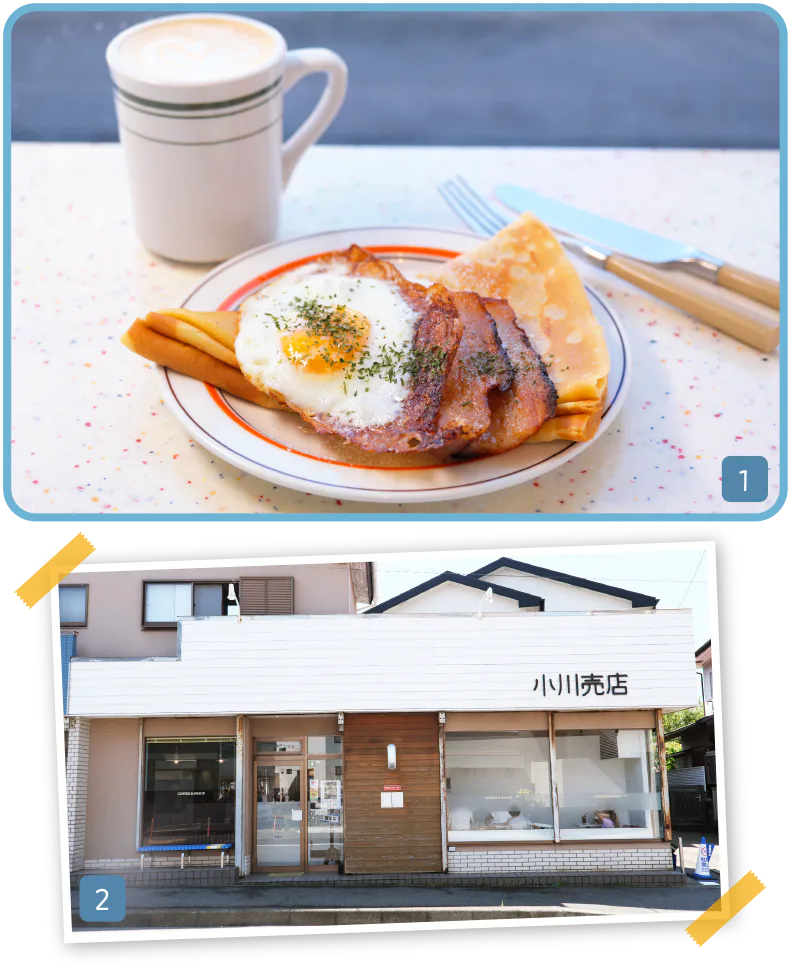 1.クレープとカフェラテのモーニング870円に目玉焼き100円と自家製ベーコン220円をトッピング/ 2.写真店だった建物をリノベーション