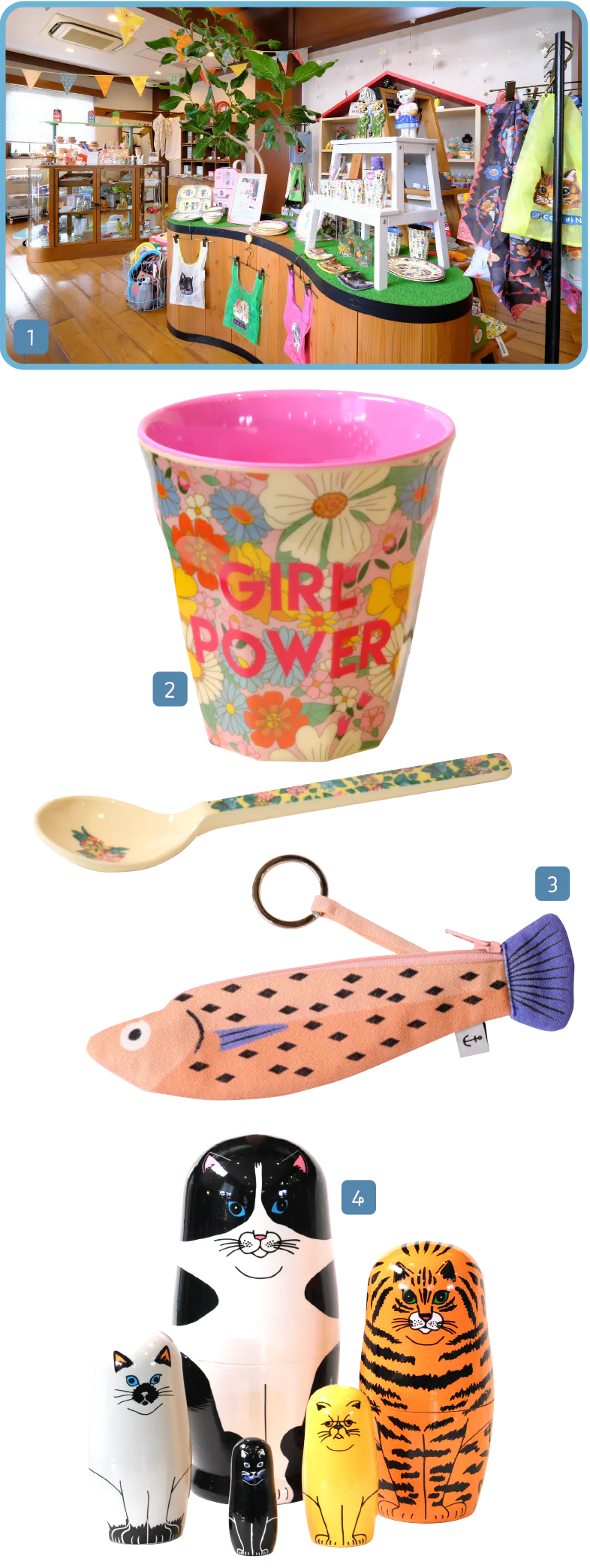 1.カラフルなアイテムがぎっしり/ 2.RICEのメラミンカップ990円~、ショートスプーン550円/ 3.Don Fisherのキーチェーン3080円/ 4.MIDORI KOMATSU のマトリョーシカ3960円