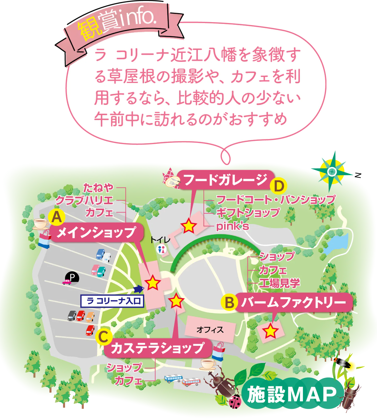 八幡山のふもとに広がる、和菓子の「たねや」とバームクーヘンで有名な「クラブハリエ」のショップが集結したフラッグシップ店。工場見学や、できたてのお菓子が楽しめるカフェなどお楽しみ満載。時間をたっぷりとって訪ねよう。