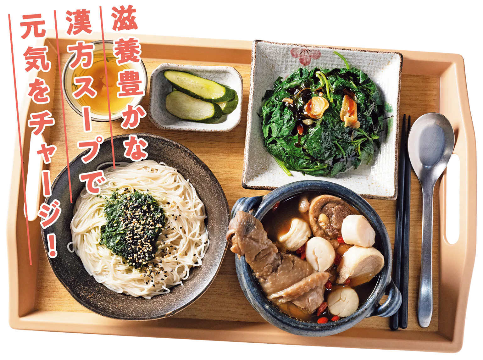 ホタテ、鮑、地鶏が入った薬膳スープに、季節の菜野、香椿麵線または五穀飯から選ぶ。漢方初心者でもおいしく食べられる