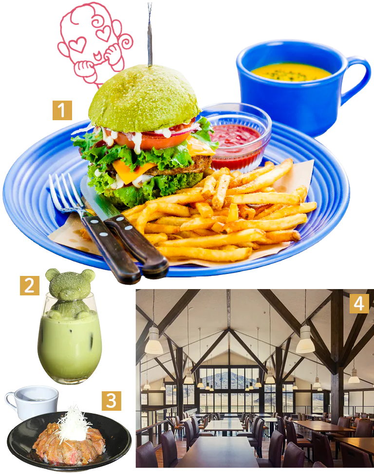 1.熊本名物のあか牛を使った「ヌッカバーガー」2360円(スープ付) 2.「くまっちゃラテ」900円。抹茶ラテの上にクマの形の抹茶シャーベットをオン 3.熊本名物「あか牛」がのった「あか牛丼」2950円(お吸い物付) 4.草千里ヶ浜の正面にあり、絶好のロケーションを誇る広々とした店内