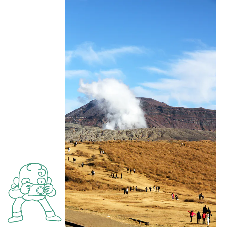草千里ヶ浜や阿蘇火口見学はもちろん、徒歩移動が多いので、スニーカーなど歩きやすい靴がおすすめ。駅や観光地にタクシーは常駐していないが、電話して呼ぶことは可能。宿坊では住職との語らいも貴重な体験、事前に聞いてもらいたい話などを頭の中で整理しておくのも良い方法。写経はゆっくりと無になって書きたいので、時間的な余裕をもってチェックインしよう。帰りの空港行きリムジンバスの最終便は15時台なので気をつけて。