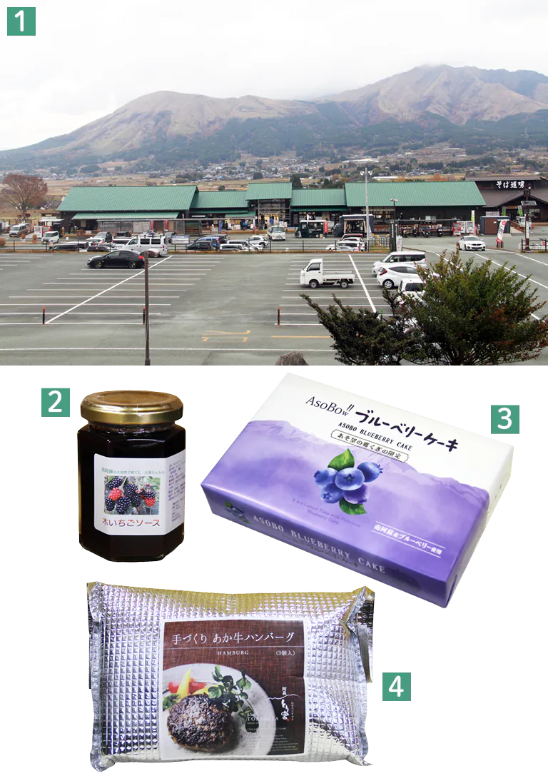 1.背景には阿蘇の大パノラマが広がる 2.手積みした実で作った木いちごソース150g580円 3.一番人気のブルーベリーケーキ650円 4.あか牛専門店手作りのハンバーグ2個入り1300円