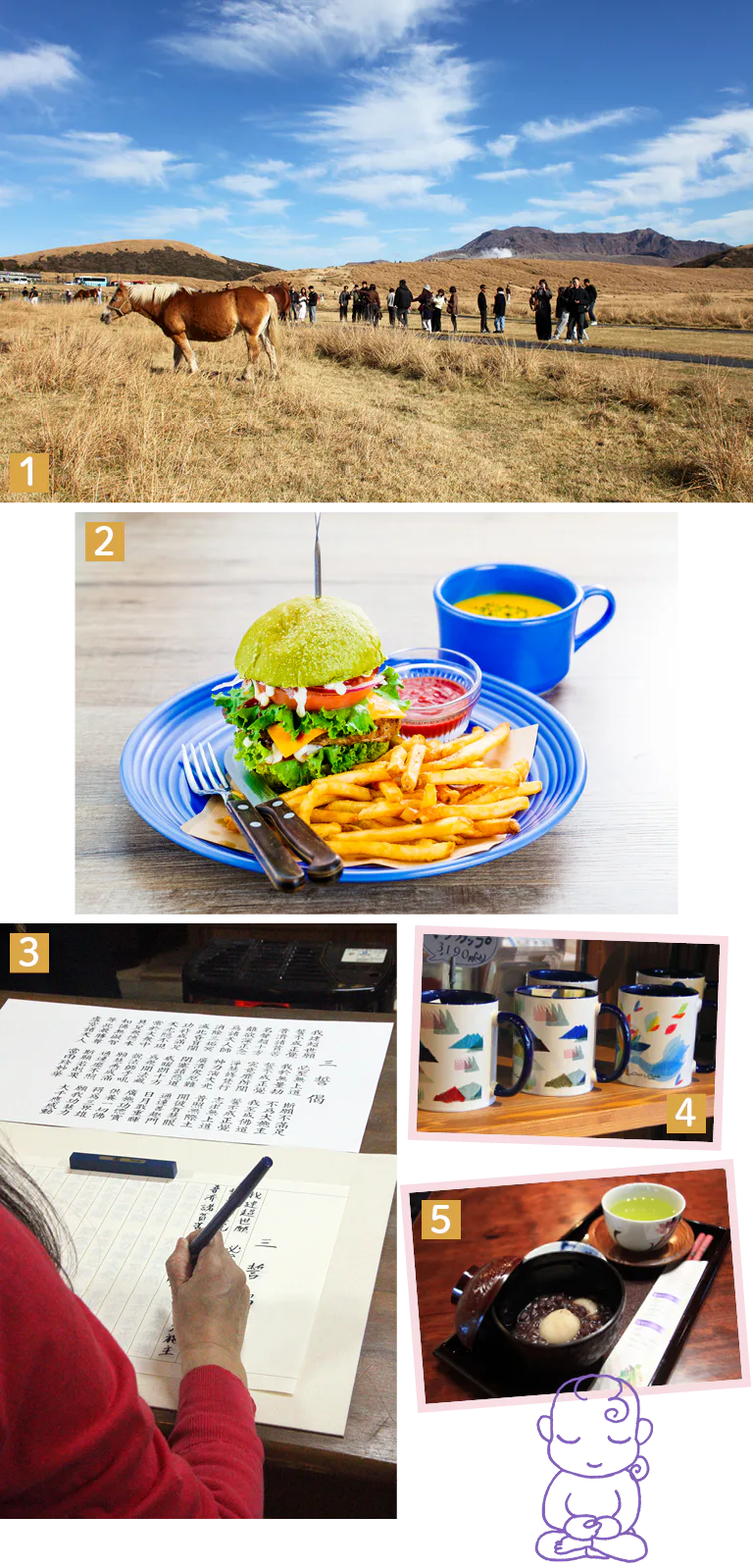 1.標高約1100mの高さにある大草原「草千里ヶ浜」 2.「douce Nucca」で一番人気のあか牛を使ったバーガー 3.写経体験。写経専用の紙と筆ペンで阿弥陀仏の誓いである「三誓偈(さんせいげ)」を書き写す 4.「douce Nucca」で販売している阿蘇をイメージしたオリジナルグッズ 5.「了廣寺宿坊」のウェルカムティー。甘いぜんざいに塩昆布が添えてある