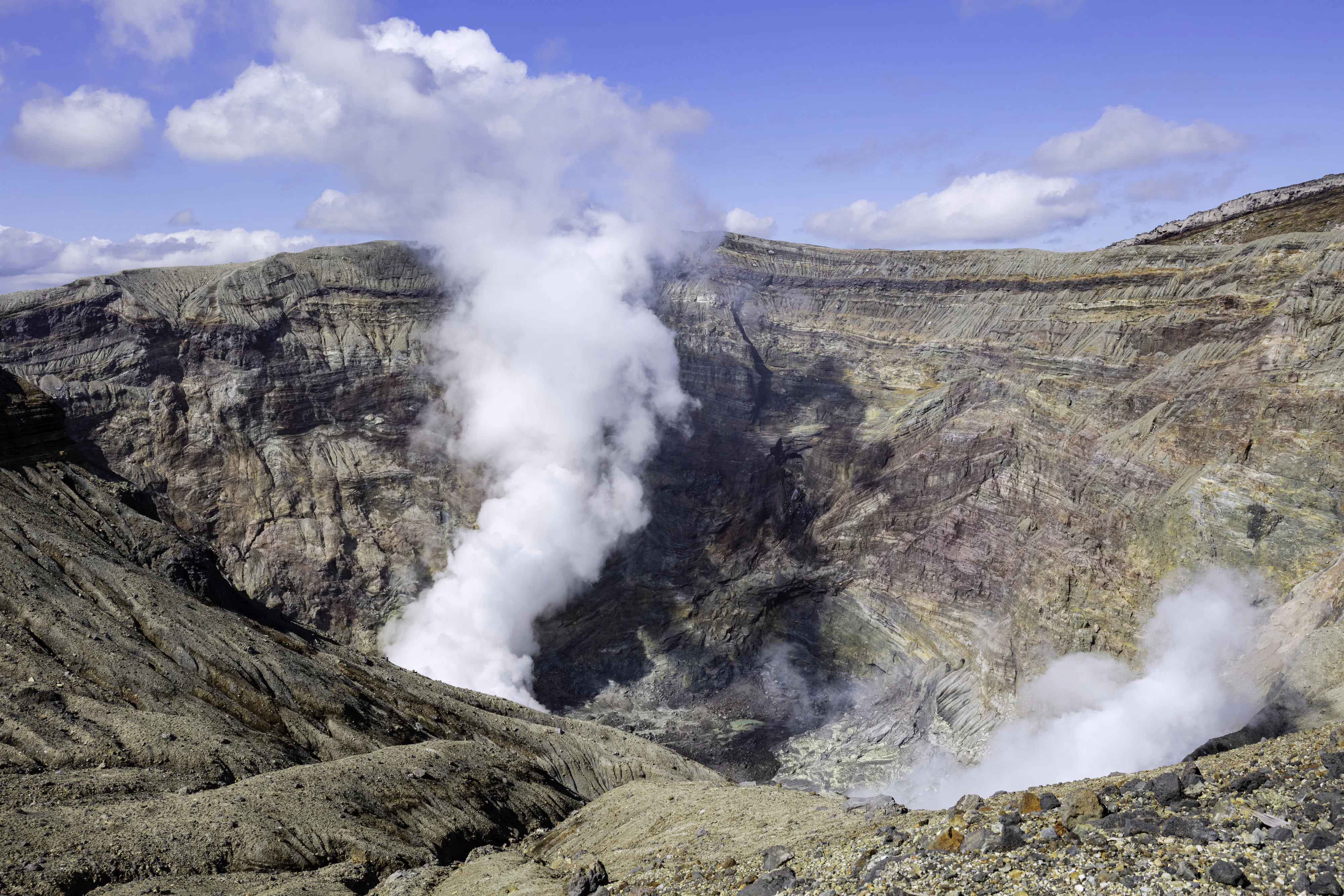 第1火口。噴煙や溶岩、火口壁など、迫力ある風景を楽しめる