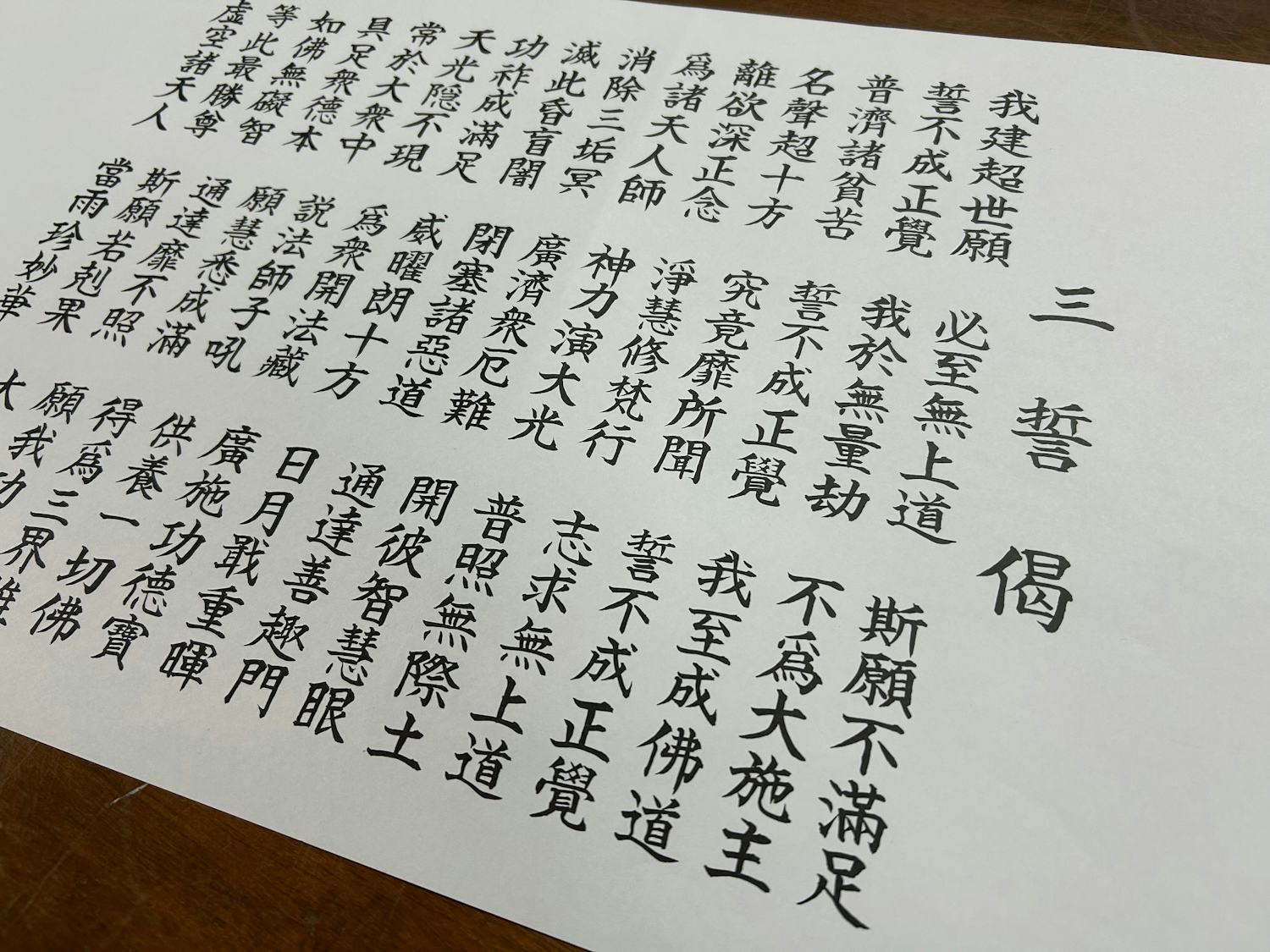 仏教の経典(お経)を一文字一文字、心を込めて書き写すことで、仏の教えを学び、功徳(ご利益)を積むための仏教修行のひとつ。心を無にして書くことで、集中力を高め、心を整える。了廣寺では、写経体験用に1時間ほどで書ける短めの偈文「三誓偈」を用意。「三誓偈」とは、仏説無量寿経の中に含まれる五字四十四句の偈文で、阿弥陀仏はすべての人を救うため、四十八の本願をおこし、心貧しく悩み苦しむ人々を救うことができなければ決して仏にはならないと重ねて誓ったという。