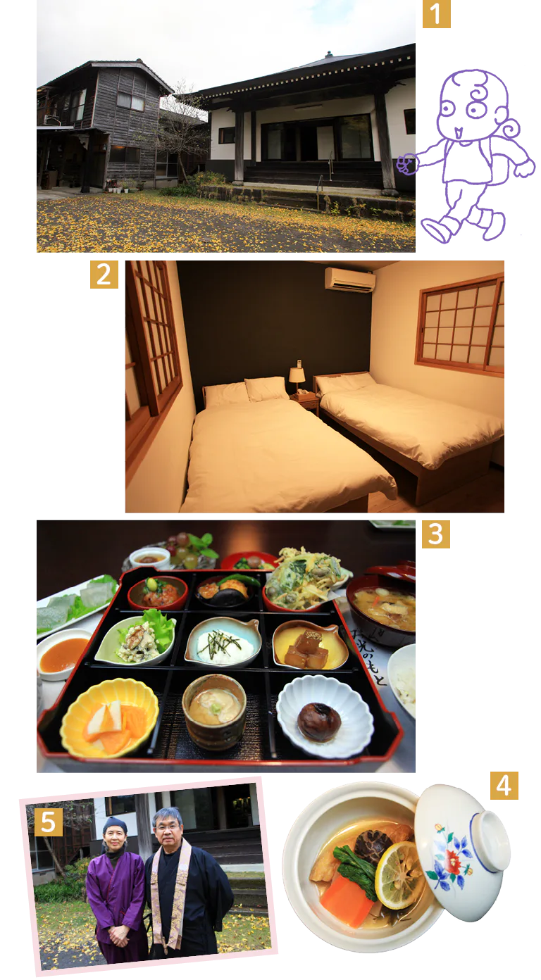 1.2016年の熊本地震後、築180年の本堂の隣に半壊した建物の一部を改装し宿坊をオープン(右が本堂) 2.3部屋とバス・トイレ付の広々とした空間 3.法要の後に出されるお斎をベースに坊守が作る創作精進料理(写真は松花堂コース、季節で内容が変わる)。素材は先代住職が近くの畑で丹精込めて育てた野菜が中心 4.煮物に入っている大きな厚揚げは開祖の親鸞聖人の好物に由来し、真宗大谷派の精進料理の特徴。手作りで、弾力がありジューシー 5.小林智征(こばやしともゆき)住職と坊守で料理担当の光里(あかり)さん