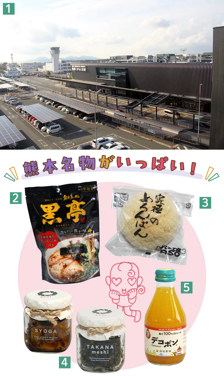 1.熊本城をモチーフにデザインされた阿蘇くまもと空港の新旅客ターミナルビル 2.熊本の名店、黒亭(こくてい)ラーメンの2食入り950円 3.林檎の樹の「究極のめろんぱん」1個335円 4.ご飯のお供に。徳丸漬物「生姜の醤油漬け」と「高 菜の油いため」各50g470円 5.デコポンジュース378円