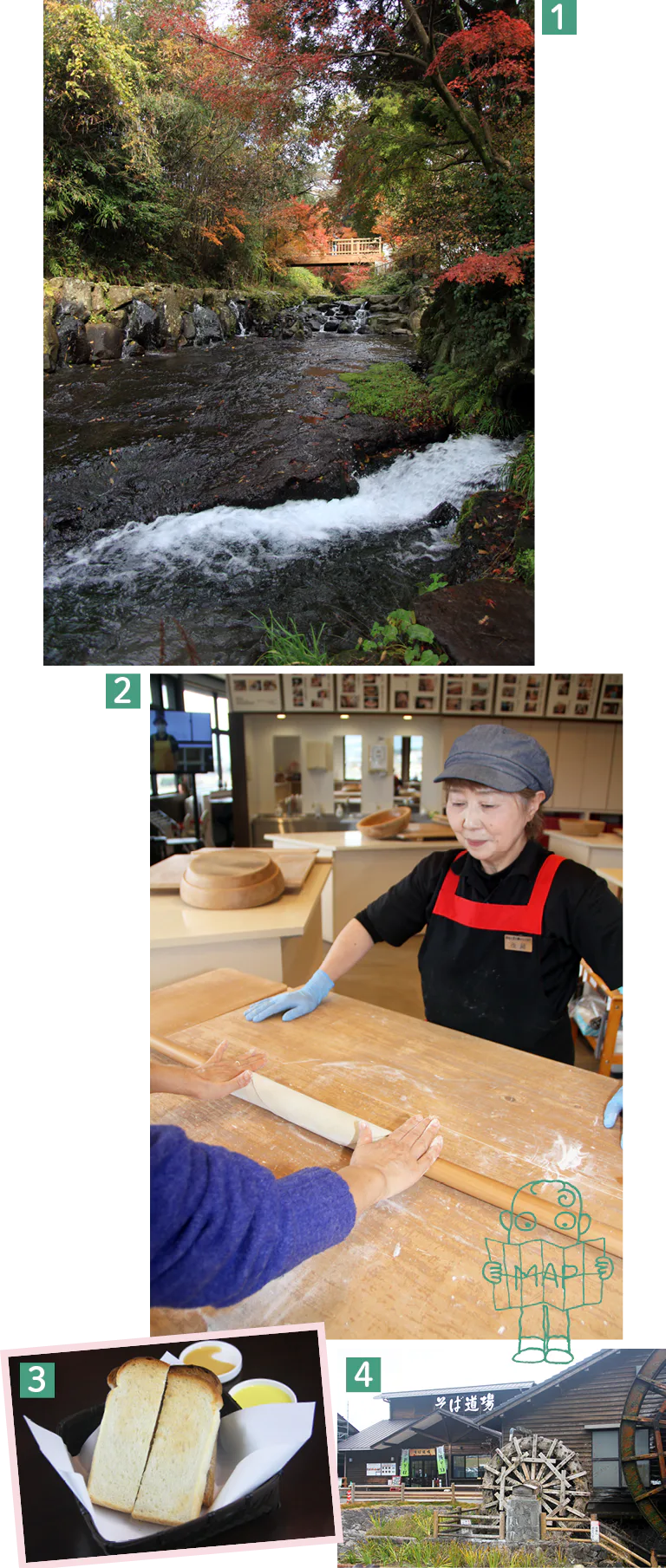 1.秋は紅葉が美しい、白川水源からの水が流れる白川 2.南阿蘇そば道場では自分で打ったそばを楽しもう 3.宿坊の手作りパン。パンの種類は10種類ほどあり、この日の食パンはプレーンとクルミ入り 4.水車小屋のそばにある南阿蘇そば道場