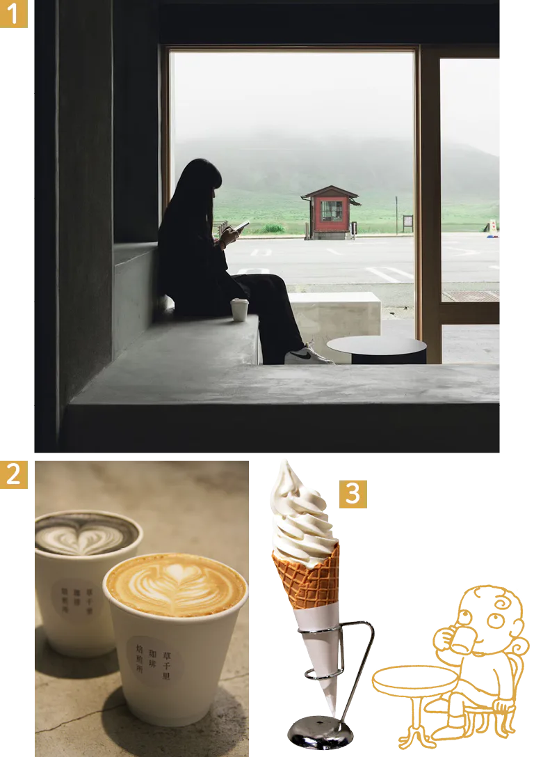 1.草千里ヶ浜の雄大な景色を眺めながらこだわりのコーヒーを堪能 2.(手前)濃厚なエスプレッソとミルクのまろやかな甘みがマッチしたエスプレッソラテ600円、(奥)エスプレッソにデトックス効果が期待できる竹炭パウダーを混ぜたチャコールラテ 3.ASO MILKの一番人気、ミルクソフト(カップ500円、コーン550円)