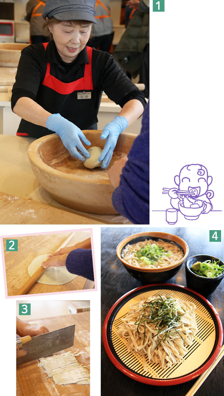 1.こね鉢の中に南阿蘇産のそばを石臼で挽いたそば粉と小麦粉を混ぜ合わせ、水を少しずつ入れ混ぜ合わせる 2.伸ばし板に取り粉を引いて、棒で徐々に薄く伸ばしていく 3.伸ばしたものをそば切り包丁で幅2mm程度に切っていく 4.作ったそばは厨房で料理してくれる。持ち帰りの場合は別途容器代440円