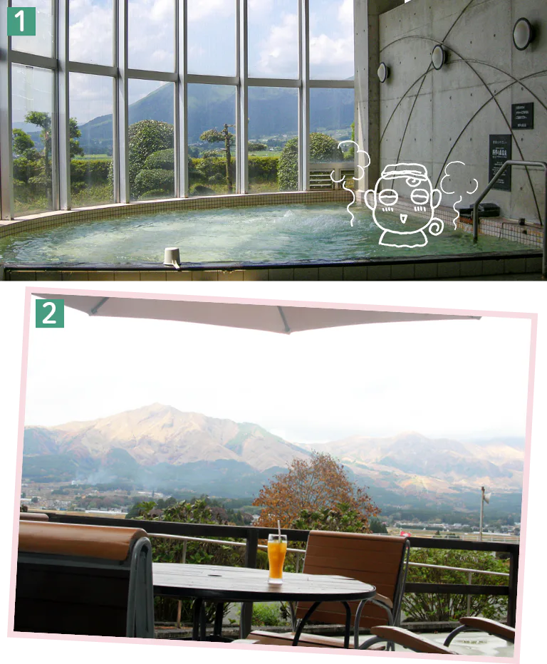 1.窓の外に阿蘇の山並みと田園風景が広がる大浴場 2.湯上りには阿蘇の大自然を眺めながらテラス席でのんびり