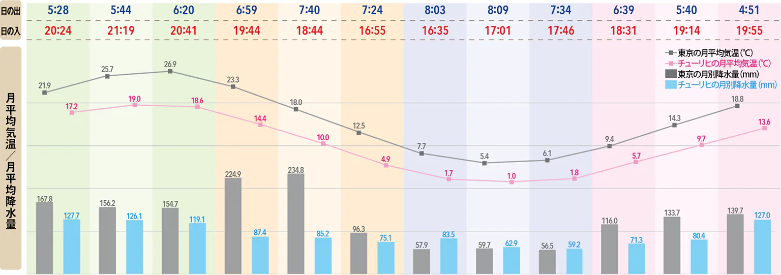 ※日の出、日の入は2025年6月〜2026年5月のチューリヒの時刻。気温・降水量は理科年表2025を参照。