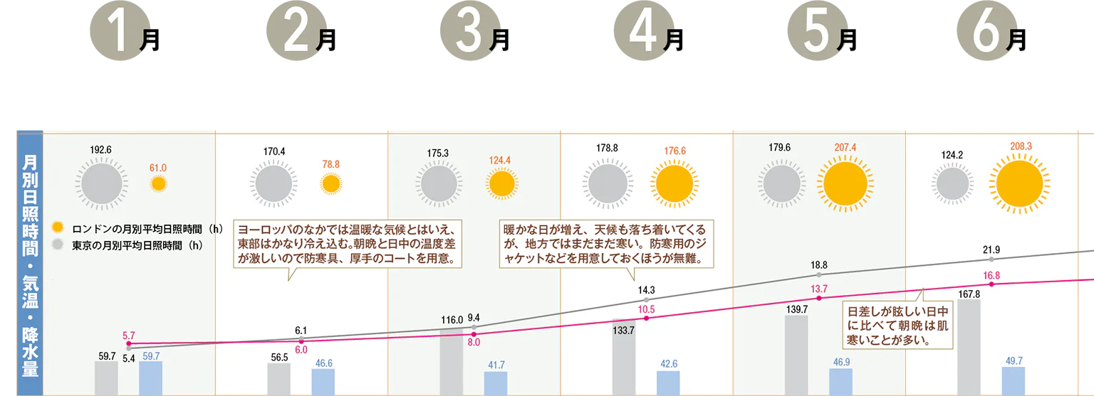 イギリスは北海道より高緯度に位置しており、夏場は湿度も低く、平均気温20℃以下と過ごしやすいうえ、21時ごろまで明るい。庭園の花が最も咲き揃うのは4〜6月。