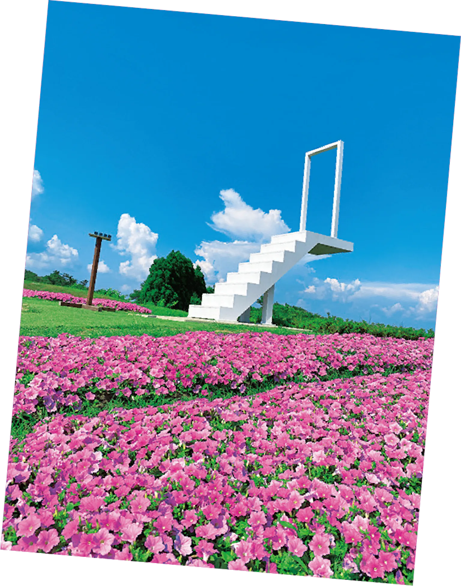 お花畑のなかに天空へと続く階段が。眼下にはびわ湖が広がる