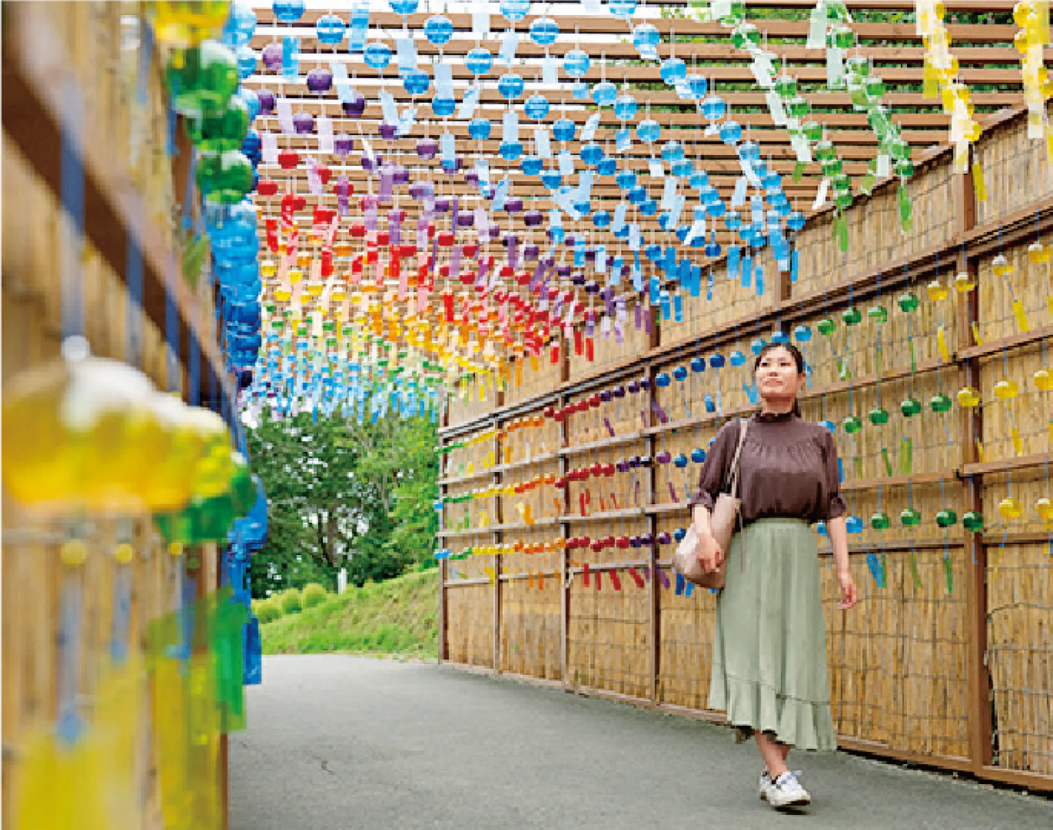 虹色の風鈴とびわ湖の浜辺に生える葦(よし)がコラボ
